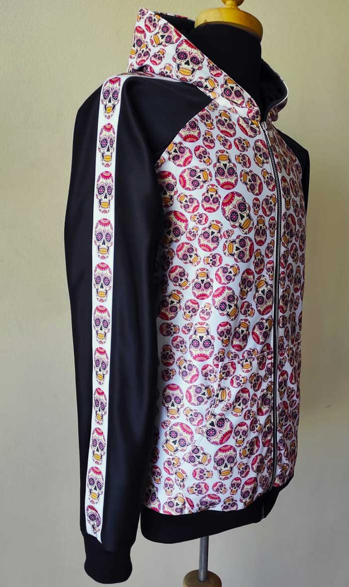 Polerón con capucha, cierre frontal, manga ranglan con franja central y bolsillo canguro. Tela estampada con diseño exclusivo.